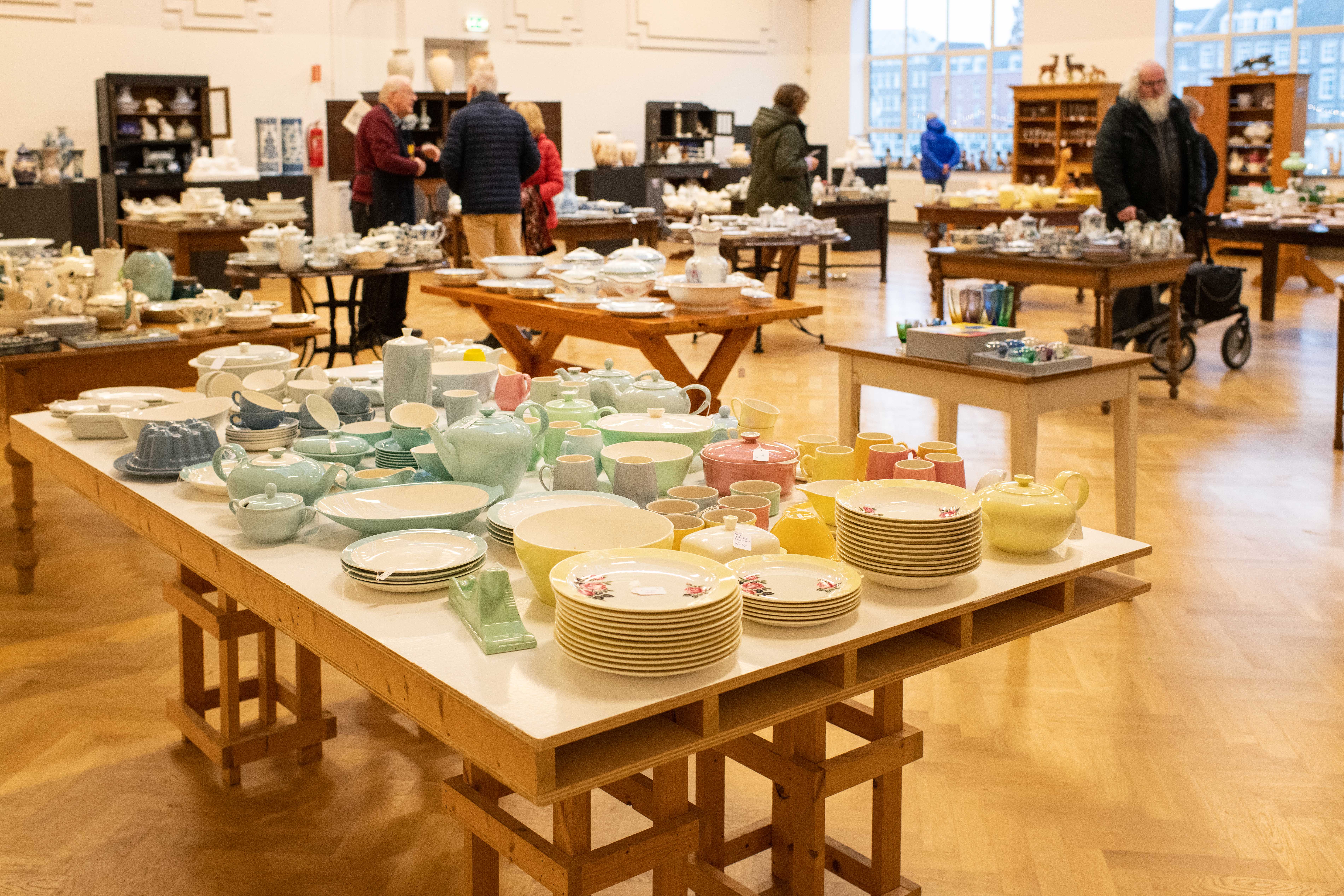 Tijdens De Toonzaal tonen en verkopen verzamelaars en liefhebbers een rijke selectie keramiek en glas uit onder andere de fabrieken van Regout, Sphinx, Société Céramique, JeMa, MOSA, Astra en Kristalunie.